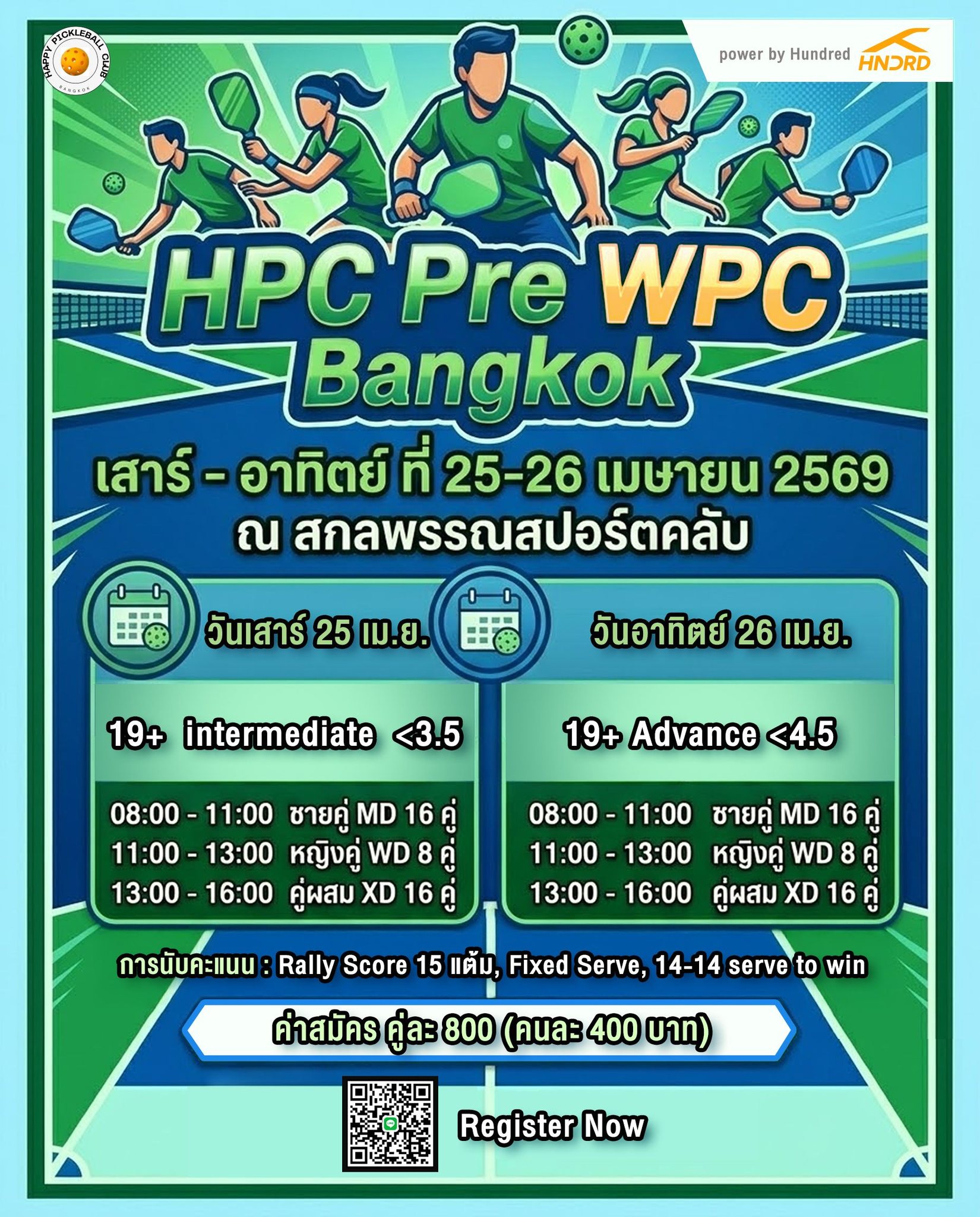 🏆 Get Ready for the Ultimate Warm-Up Tournament! Whether you are gearing up for the major leagues or stepping onto the court for your first competition, join us for an exciting weekend tournament at Sakolpan Sport Club on April 25–26, 2026! 📅 Tournament Schedule & Categories Saturday, April 25, 2026 | Age 19+ Intermediate (DUPR < 3.5) 08:00 – 11:00: Men's Doubles (MD) — 16 Teams 11:00 – 13:00: Women's Doubles (WD) — 8 Teams 13:00 – 16:00: Mixed Doubles (XD) — 16 Teams Sunday, April 26, 2026 | Age 19+ Advanced (DUPR < 4.5) 08:00 – 11:00: Men's Doubles (MD) — 16 Teams 11:00 – 13:00: Women's Doubles (WD) — 8 Teams 13:00 – 16:00: Mixed Doubles (XD) — 16 Teams 🎟️ Entry Fee 800 THB per team (Only 400 THB per person) 📋 Tournament Rules Standard Matches: Rally Score to 15 points. Fixed serve, win by 1. (If tied at 14:14, you must serve to win). Medal Rounds: Rally Score to 21 points. Fixed serve, win by 1. (If tied at 20:20, you must serve to win). Officiating: Matches are self-officiated (no referees), with the exception of the Final matches. ✨ Exclusive Prizes & Perks Road to WPC Bangkok: The champions of this tournament will earn a FREE entry to compete in the WPC Bangkok in either the Intermediate+ or Advance+ division! Please note: Winners must register for WPC Bangkok directly, and our organizers will process a full refund for the entry fee. If you do not register, the prize is forfeited. (This privilege is non-transferable). Sponsored Rewards: 1st, 2nd, and 3rd place winners will have the chance to take home special prizes from our generous sponsor, Hundred! Athlete Care: Watcharapol Clinic will have a booth on-site providing services and care for all participating athletes throughout the event. Spots are limited! Register now to secure your place on the court.
