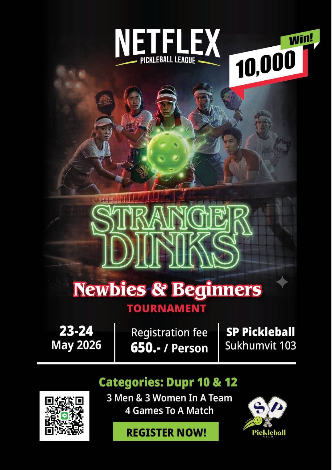 🏓 Netflex Pickleball League Series: Stranger Dinks [Newbies & Beginners] Ready for your first fun pickleball tournament? Welcome to Stranger Dinks — a beginner-friendly team tournament made for new players who want to compete, learn, and have fun. ✨ Tournament Format • Team format: 3 Men + 3 Women • 4 games per match • Rally scoring to 21 This is the perfect first step into competitive pickleball — without the pressure. Whether you’ve just started playing or are still building confidence, this event is all about: ✅ Friendly competition ✅ Meeting new pickleball friends ✅ Enjoying a fun and supportive community ✅ Gaining match experience for future tournaments Come play, laugh, and experience the energy of team pickleball in a welcoming environment. No stress, just good games, good vibes, and a great way to level up your pickleball journey. Start as strangers. Leave as teammates. See you at Stranger Dinks. 🎾